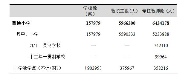 全国共有普通小学15.80万所,比上年减少2169所,下降1.35%。另有小学教学点9.03万个,比上年减少0.62万个。招生1808.09万人,比上年减少60.95万人,下降3.26%;在校生10725.35万人,比上年增加164.12万人,增长1.55%;毕业生1640.32万人,比上年减少7.58万人,下降0.46%。小学学龄儿童净入学率[6] 99.96%。