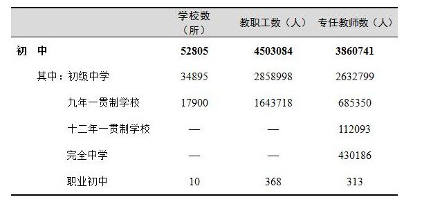 全国共有初中5.28万所(含职业初中10所),比上年增加390所,增长0.74%。招生1632.10万人,比上年减少6.75万人,下降0.41%;在校生4914.09万人,比上年增加86.95万人,增长1.80%;毕业生1535.29万人,比上年增加81.20万人,增长5.58%。初中阶段毛入学率[4] 102.5%。