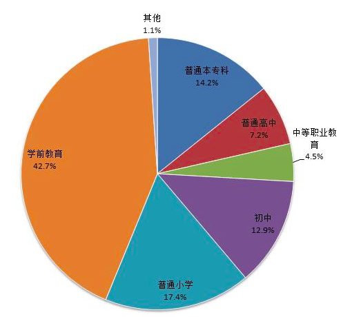 小学教职工[7] 596.63万人,比上年增加11.37万人,增长1.94%;专任教师[8] 643.42万人,比上年增加16.51万人,增长2.63%。专任教师学历合格率[9] 99.98%,生师比16.67:1。
