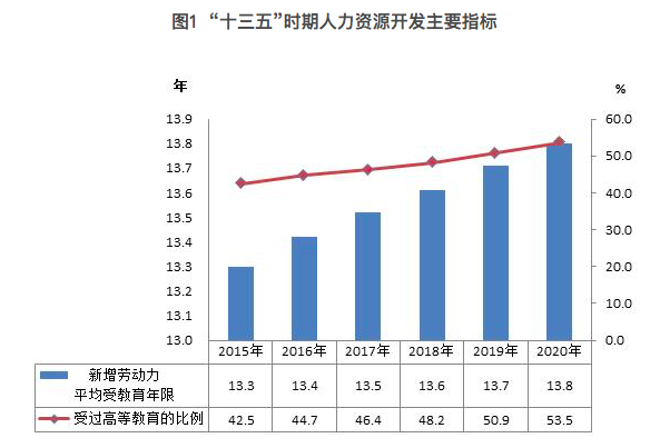 全国新增劳动力平均受教育年限13.8年,比上年提高0.1年,其中,受过高等教育比例达到53.5%,比上年提高2.6个百分点。
