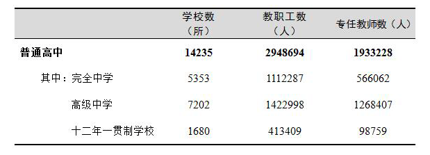 普通高中教职工294.87万人,比上年增加11.50万人,增长4.06%;专任教师193.32万人,比上年增加7.40万人,增长3.98%。生师比12.90:1;专任教师学历合格率98.79%,比上年提高0.17个百分点。