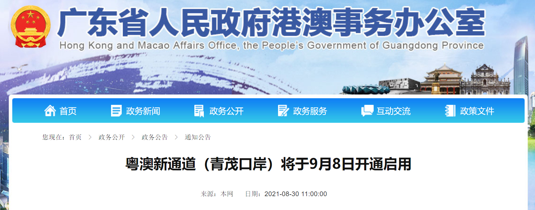 据广东省人民政府港澳事务办公室网站消息,经国务院批复同意,粤澳两地政府协商一致,粤澳新通道(青茂口岸)定于2021年9月8日下午3时正式开通启用。