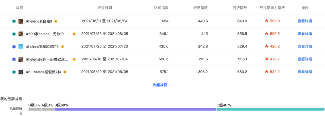 根据时趣洞察引擎,我们分析了「海伦司」近期的5次典型品牌战役,从认知指数、好感指数、拥护指数,以及战役影响力指数上来看,品牌战役表现良好,但在好感指数方面存在较大落差,且整体战役均处于B级别、C级别,缺少A级别及以上的品牌战役。