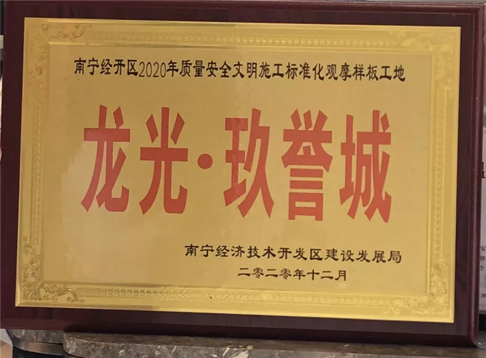 座房子本身就是一个故事,好房子值得品味的地方,远远不止表面看上去的线条、造型那么简单,更多的是对细节、材质和工艺的严格考究,对待房子的态度,理应像对待一件价值不菲的工艺品,讲究表里如一。龙光玖誉城以非凡品质,打动了消费者更打动了业界。---2020年12月,荣膺南宁经济技术开发区建设发展局颁发的“南宁经开区2020年质量安全文明施工标准化观摩样板工地”奖项。