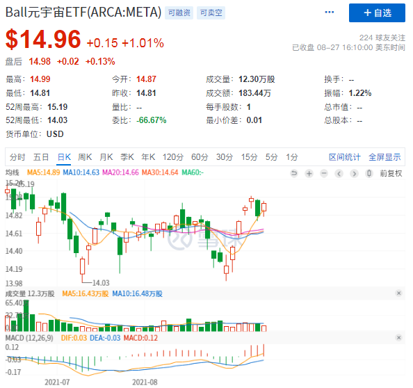 海内外的基金公司也发行了相关概念的基金。比如银华VR ETF(159786)号称全市场首只“元宇宙”概念ETF,在7月刚刚发布时获得了不小的市场关注。海外市场的比较有名的元宇宙概念ETF是Roundhill Investments发布的Roundhill Ball Metaverse ETF,简称“META”。从已经公布的META持仓来看,其重仓了英伟达(NASDAQ:NVDA)、腾讯(HK:00700)、Roblox(NYSE:RBLX),而Facebook(NASDAQ:FB)反而不在重仓前列。从走势表现来看,META的涨跌幅度不算剧烈。