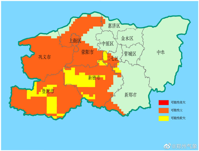 今晚到明天,郑州市地质灾害预警预报达到橙色预警的地区为:上街区,荥阳、登封、新密大部,二七区南部、新郑西北部及西南部,惠济区西部局部,发生地质灾害的可能性大。地质灾害预警预报达到黄色预警的地区为:新密西部及北部,二七区局部,登封中部及南部,新郑西北部,中原区南部,发生地质灾害的可能性较大。请相关区县(市)做好地质灾害防范工作。