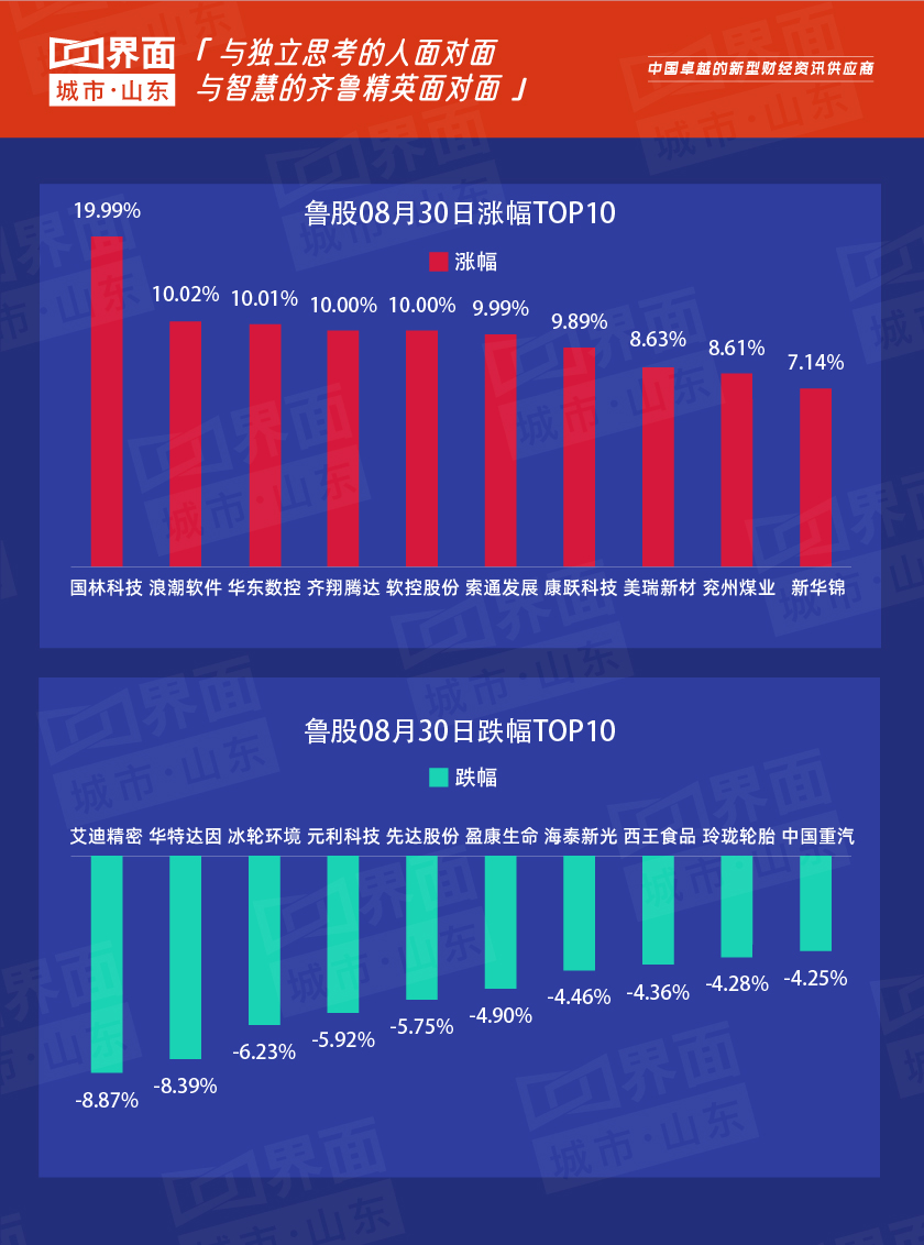 8月30日,山东108股上涨,5股持平,138股下跌。