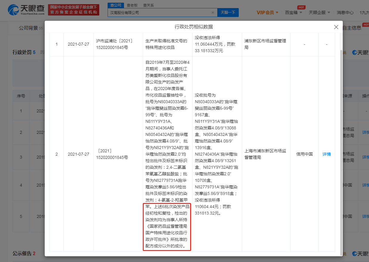 关联数据显示,处罚具体事由均为部分施华蔻染发产品经初检和复检,检出的染发剂均为当事人所持《国家药品监督管理局国产特殊用途化妆品行政许可批件》所批准的配方成分以外的成分。