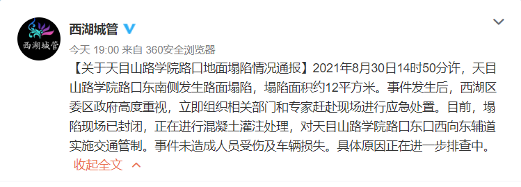 据杭州@西湖城管 通报,8月30日14时50分许,天目山路学院路口东南侧发生路面塌陷,塌陷面积约12平方米。事件发生后,西湖区委区政府高度重视,立即组织相关部门和专家赶赴现场进行应急处置。目前,塌陷现场已封闭,正在进行混凝土灌注处理,对天目山路学院路口东口西向东辅道实施交通管制。事件未造成人员受伤及车辆损失。具体原因正在进一步排查中。