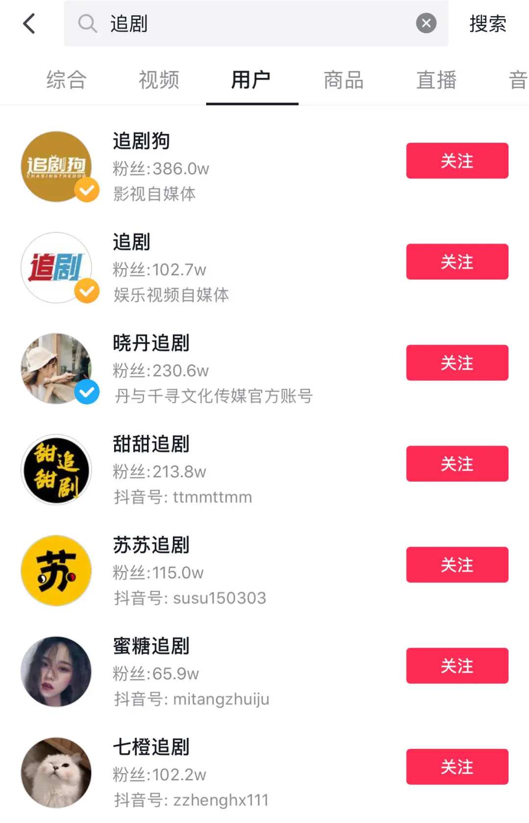 在抖音上,与“XX追剧”相关的账号多达上千个,粉丝数量超过100万的账号也有近百个。与电影多选择外国的老电影不同,很多剧集的账号直接搬运、解说近期上映的热门内容。