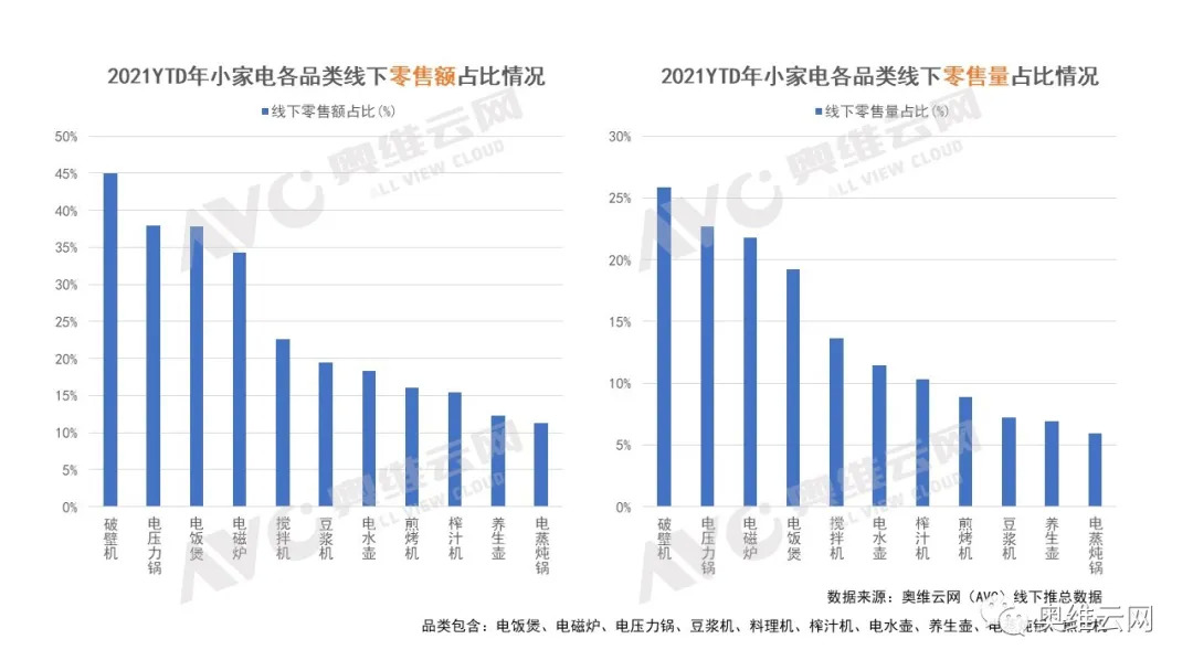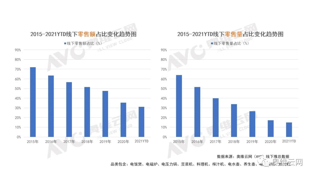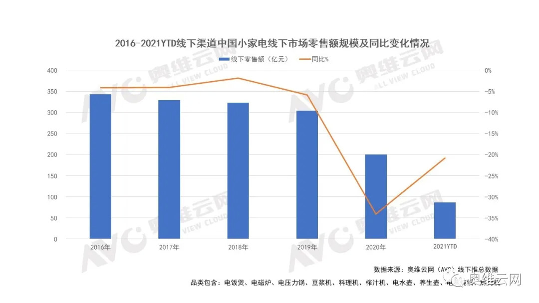 各行各业,经营的根本就是客流量。以现阶段市场来看,线下门店客流量门可罗雀。同行业竞争本身存在供给过剩的现象,加之电商的冲击以及疫情的催化,更是使得家电行业特别是小家电行业,线上渠道在2020年快速发展,线下销售渠道客源被快速分走。据奥维云网(AVC)线下渠道推总数据显示2021M1-7月,小家电(电饭煲、电磁炉、电压力锅、豆浆机、破壁机、搅拌机、榨汁机、电水壶、煎烤机(电饼铛、电热烧烤炉、多功能锅)、电蒸炖锅、养生壶)零售额共计86.7亿元,同比2020年同期下降20.9%,同比2019年同期下降51.8%;零售量1978万台,同比2020同期下降21.4%,同比2019同期下降51.5%。