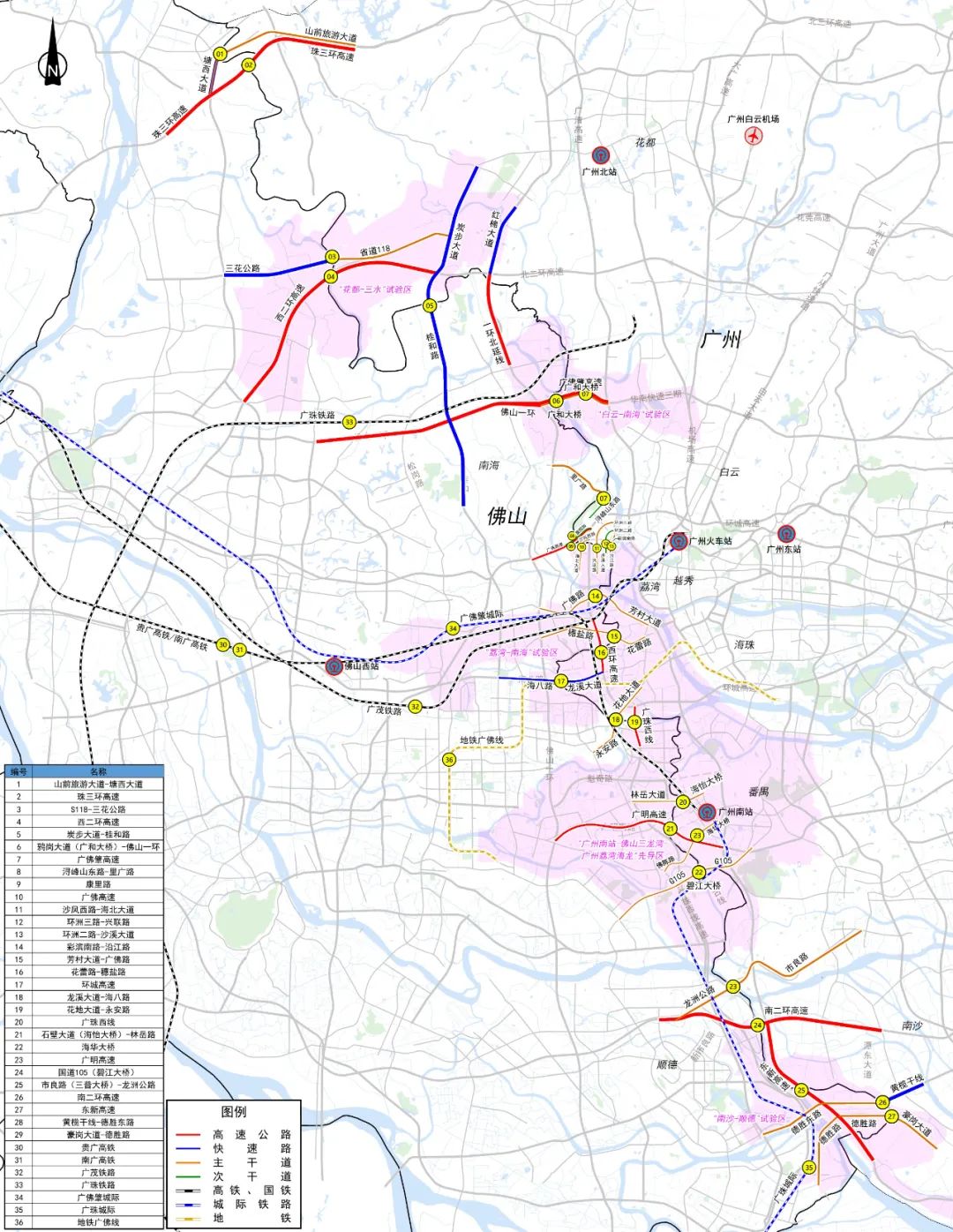 广州和佛山之间一共有36条通道供两地人员通行,其中包括7条高速公路、6条铁路(贵广高铁、南广高铁、广茂铁路、广珠铁路、广佛肇城际、广珠城际)、1条地铁线(广佛线),以及多条快速路、主干道、次干道。