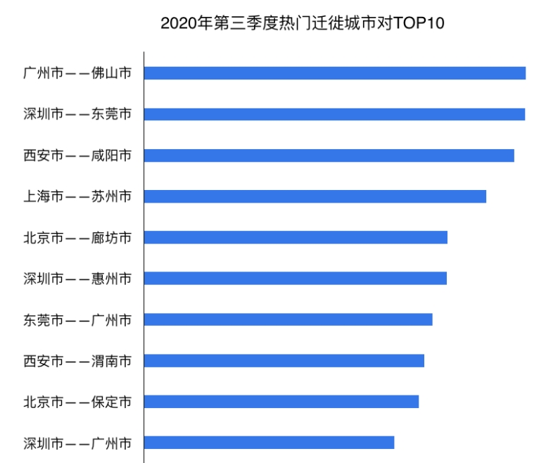 百度地图热门迁徙城市数据显示,广州和佛山之间的出行需求排在全国第一位,深圳和东莞排在第二位,西安和咸阳排在第三位。
