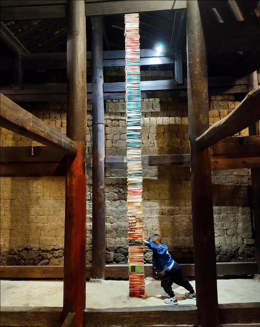 用500本在废品收购站收来的旧书做成的书柱,像天地之间的一道彩虹