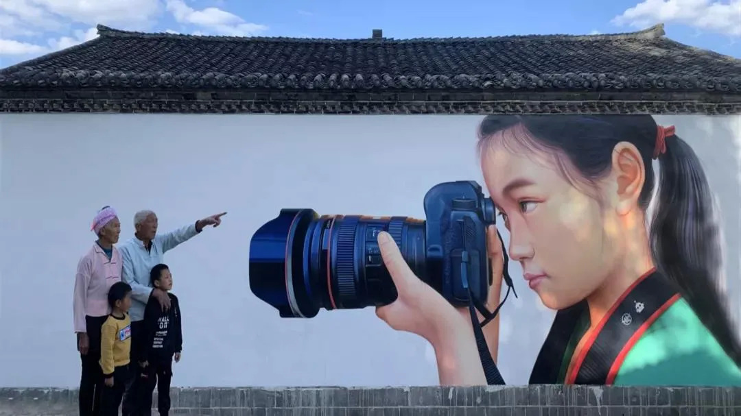 刚到村子里,一个傣族小女孩举着相机专心朝前拍摄的场景吸引了艺术家信王军的注意。于是,他将这个“发现“以画作的方式记录在墙壁之上。这幅画对村子来说起到指向标的作用,游客一到这里便想顺着相机的朝向往村子里走。并且,当人们站在小女孩的“镜头”前,摆出姿势时,这一整幅作品就完成了。