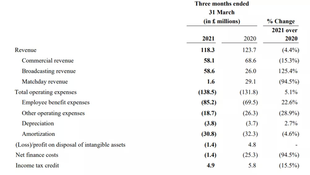 受到了疫情的严重影响,曼联19-20赛季的营业收入比前一年少了1.18亿英镑。而根据最新发布的20-21赛季第三季度财报(1月1日-3月31日),当季收入同比「只」降低了4%——但那主要是因为英超和欧冠转播分成多了3300万英镑,比赛日收入和商业收入其实分别下降了94.5%和15.3%。
