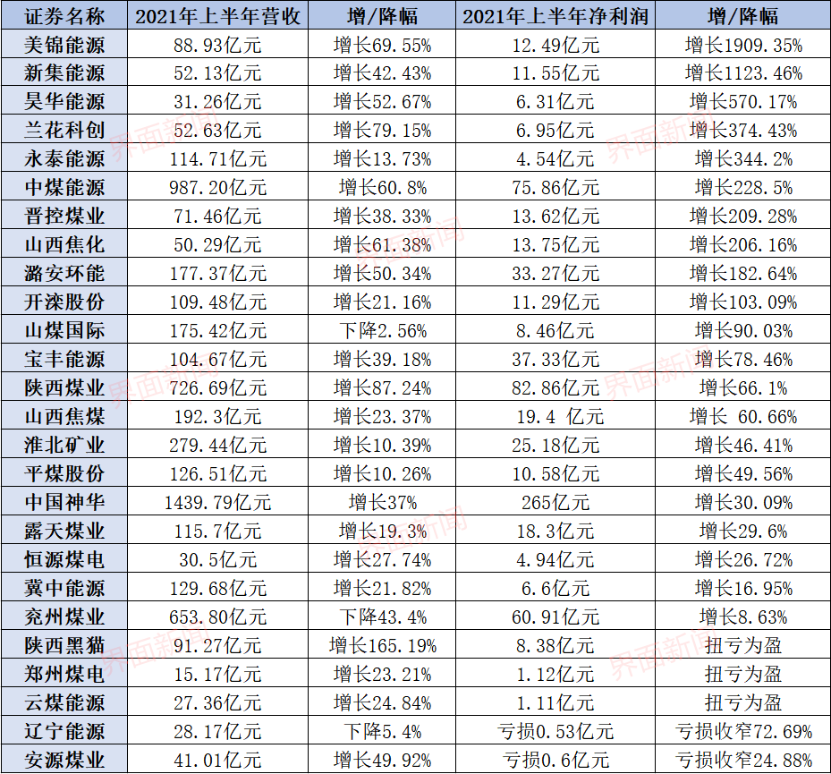 其中,美锦能源(000723.SZ)净利润增幅最高,超过19倍;新集能源(601918.SH)净利润增长超11倍;昊华能源(601101.SH)净利润增幅近6倍。