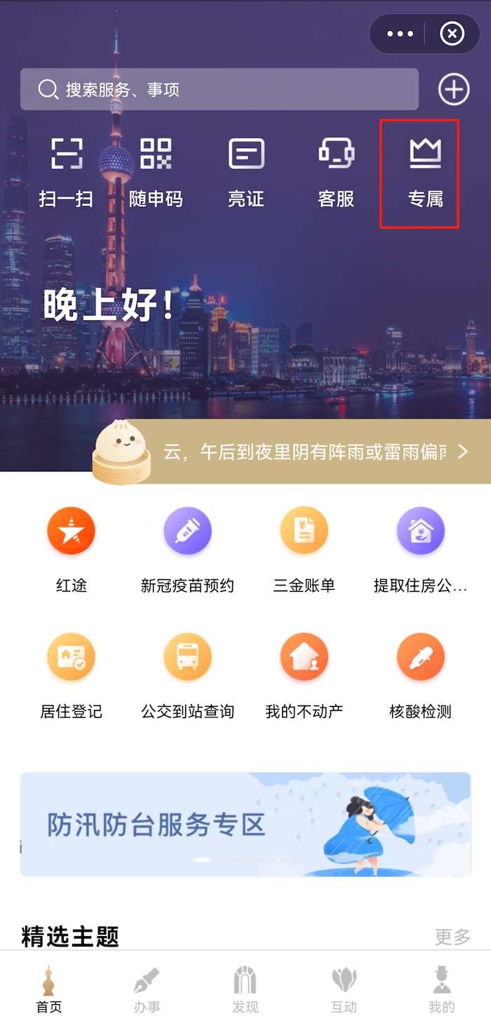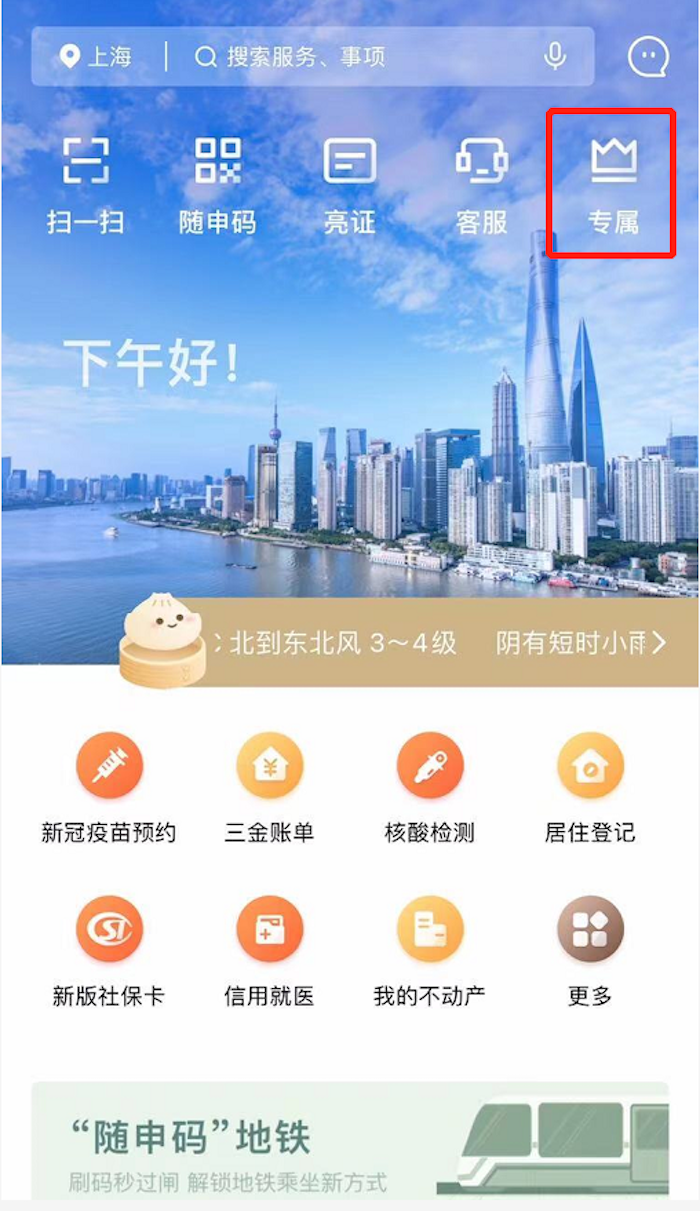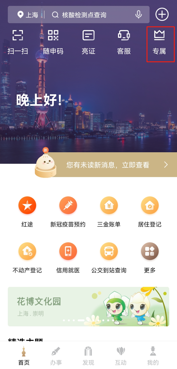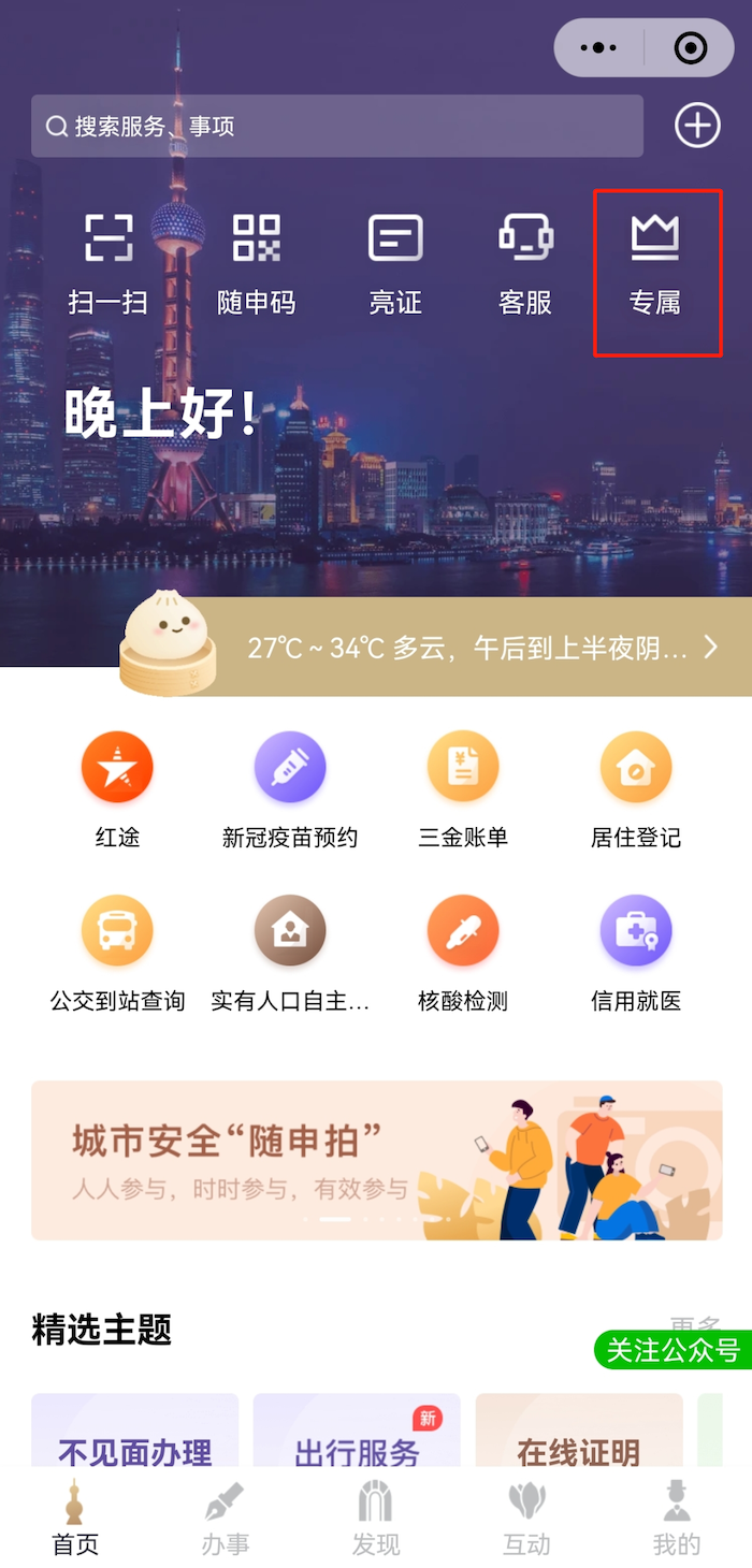 登录“随申办”APP或“随申办”微信、支付宝小程序,在首页点击“专属”或进入“随申办”微信公众号发送“专属”,进入“专属”空间就可马上体验新版“专属”空间。
