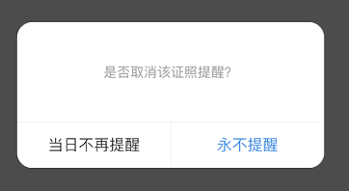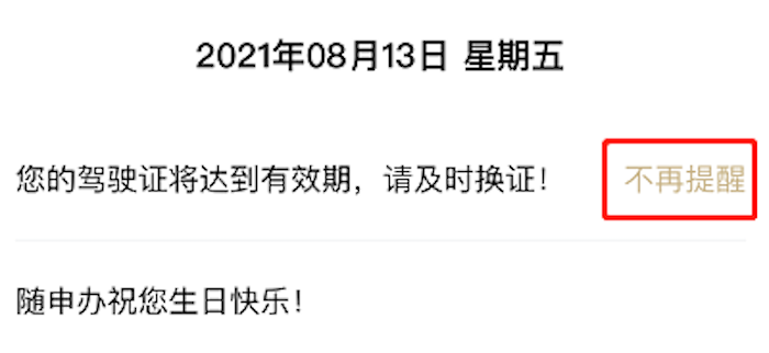 小贴士:点击证照提醒旁边的“不再提醒”,可关闭提醒,您可以根据需求选择“当日不再提醒”或“用不提醒”。