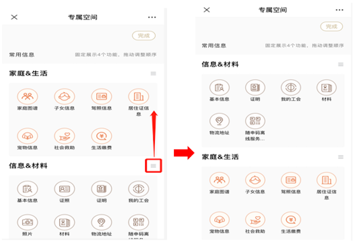 常用信息固定展示4个功能,在“编辑”中,点击常用信息和更多信息右侧对应的功能点并拖动,可任意调整顺序,不仅可以调整同类信息之间的展示顺序,也可将常用信息和更多信息中的功能互相拖动调整。