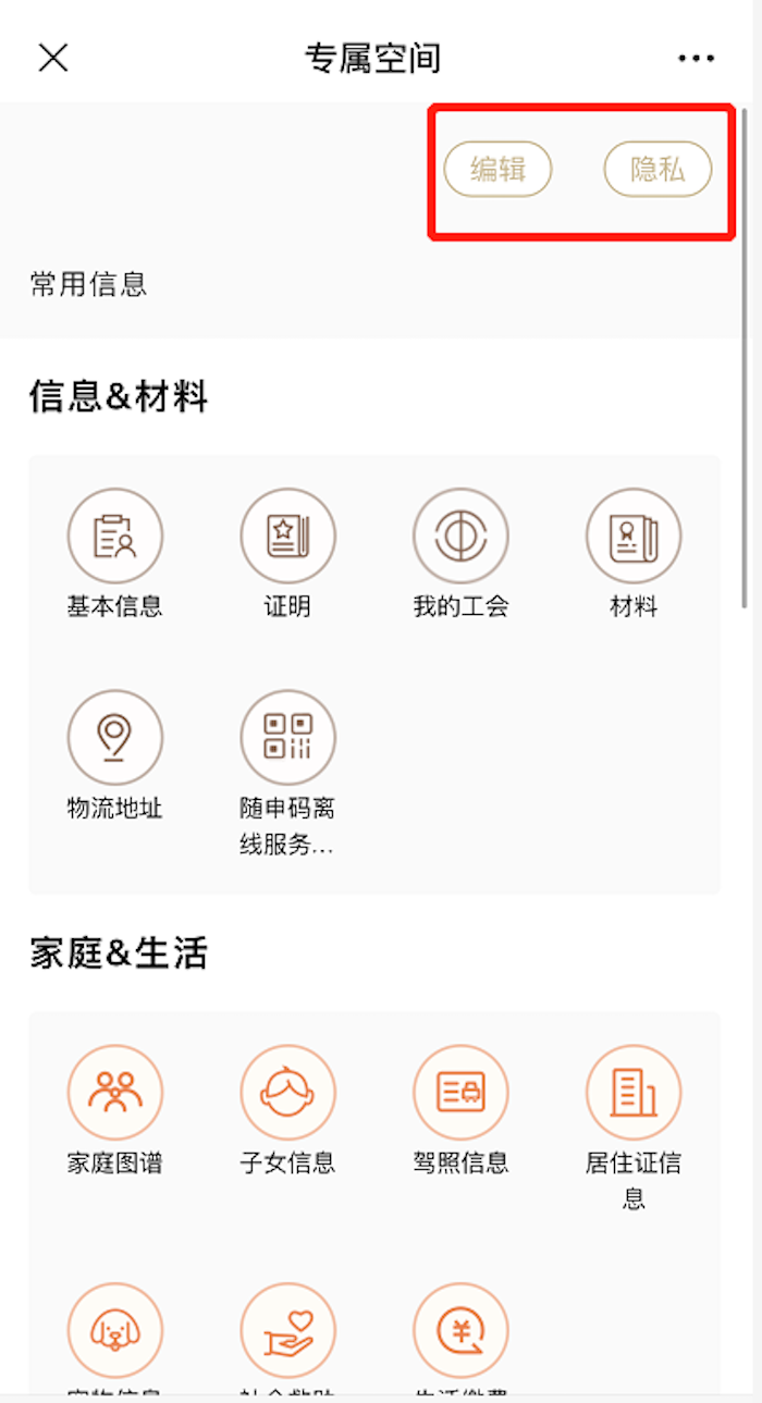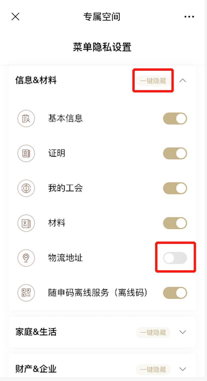 在“隐私”中,点击“一键隐藏”可隐藏该档案中的所有子功能;点击子功能右侧的图标,可隐藏相应子功能。