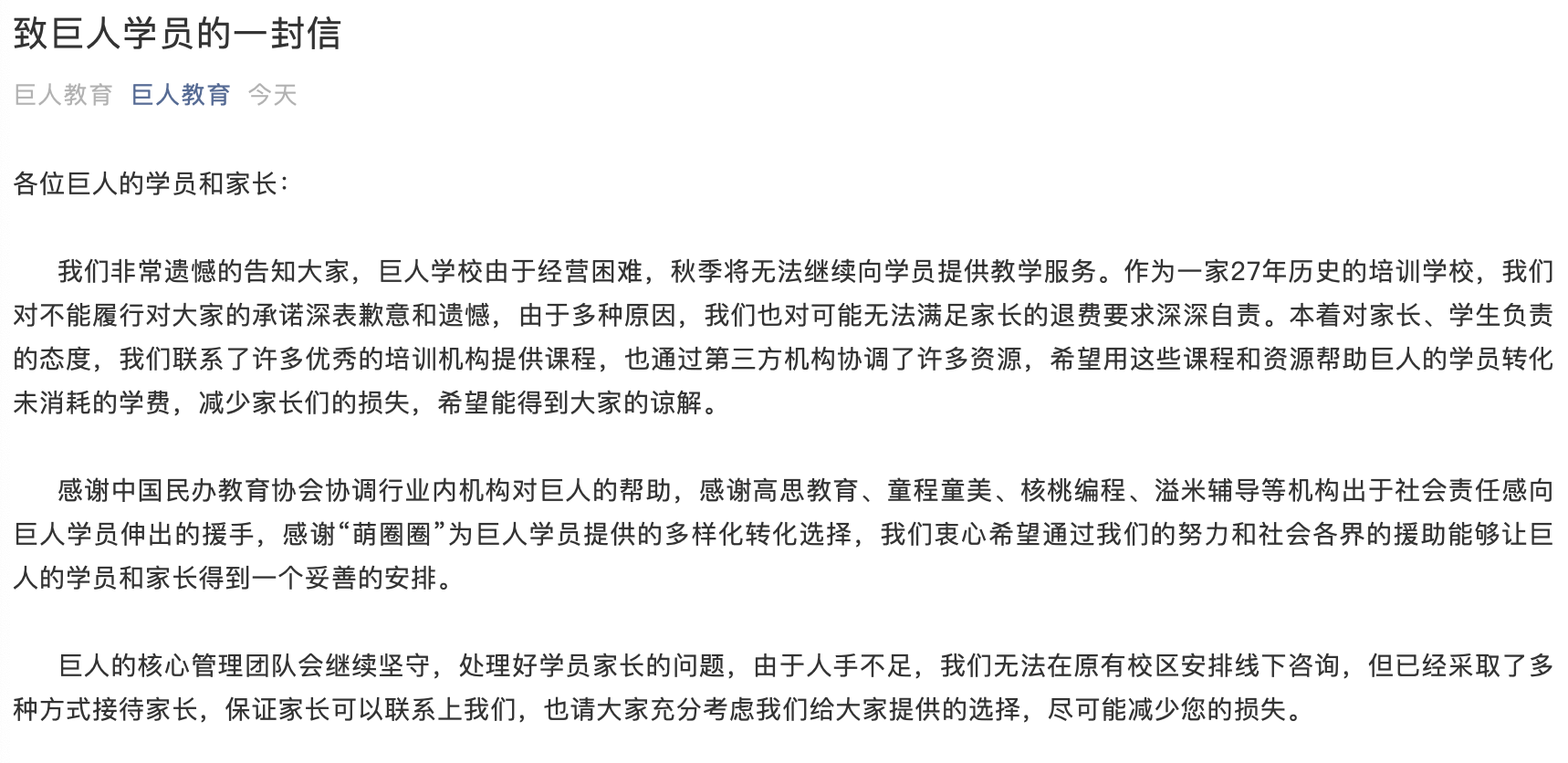 8月31日,巨人教育发布《致巨人学员的一封信》称,非常遗憾的告知大家,巨人学校由于经营困难,秋季将无法继续向学员提供教学服务。由于多种原因,公司也对可能无法满足家长的退费要求深深自责。公司联系了许多培训机构提供课程,也通过第三方机构协调了许多资源,希望用这些课程和资源帮助巨人的学员转化未消耗的学费,减少家长们的损失,希望能得到大家的谅解。