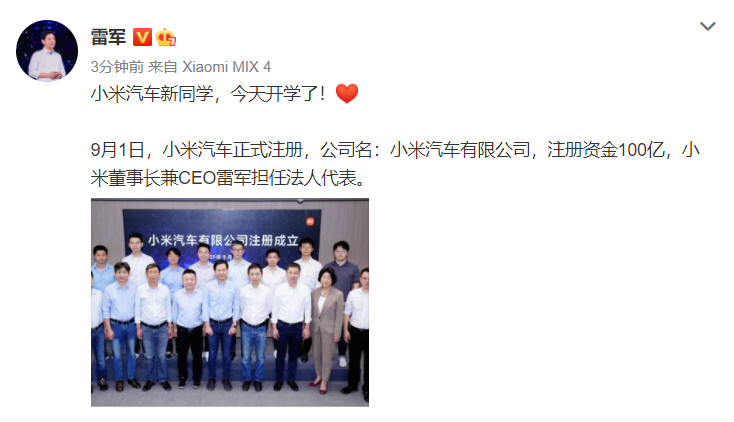 9月1日,小米集团董事长雷军发微博称,小米汽车正式注册,公司名为小米汽车有限公司,注册资金100亿,小米董事长兼CEO雷军担任法人代表。