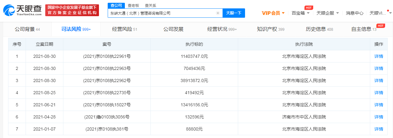 据天眼查APP显示,8月30日,ofo关联公司东峡大通(北京)管理咨询有限公司再成被执行人,三次执行标的合计超5700万元,关联案件为合同纠纷,执行法院为北京市海淀区人民法院。今年以来,该公司已多次被执行,当前执行标的合计超7000万元。