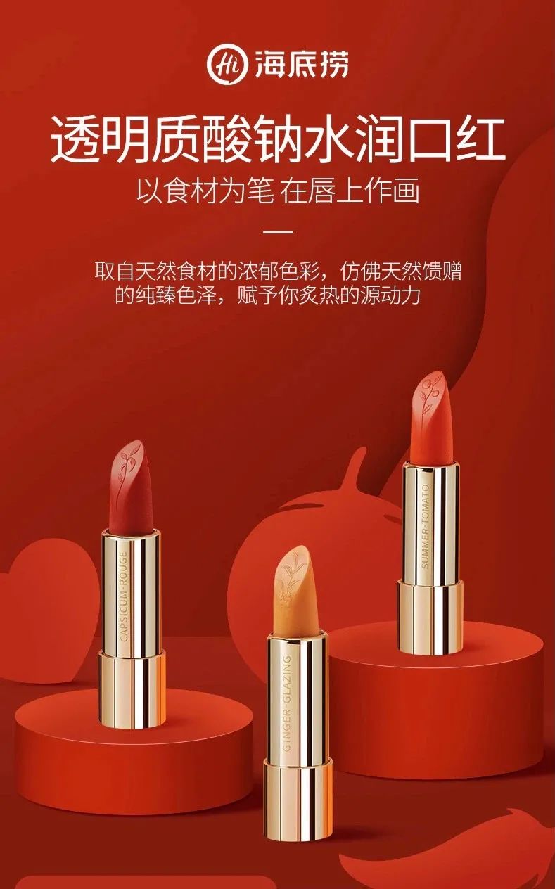 除了肯德基,海底捞最近也因为“包装”消费者而出圈了。品牌将大众熟悉的红椒、番茄、生姜三大食材设计成了周边单品,其中口红中含有这三大食材的提取物,并被命名为“红颜·椒”、“夏日·番”、“黄闪·姜”。据说味道别具一格,产品特征十分明显。