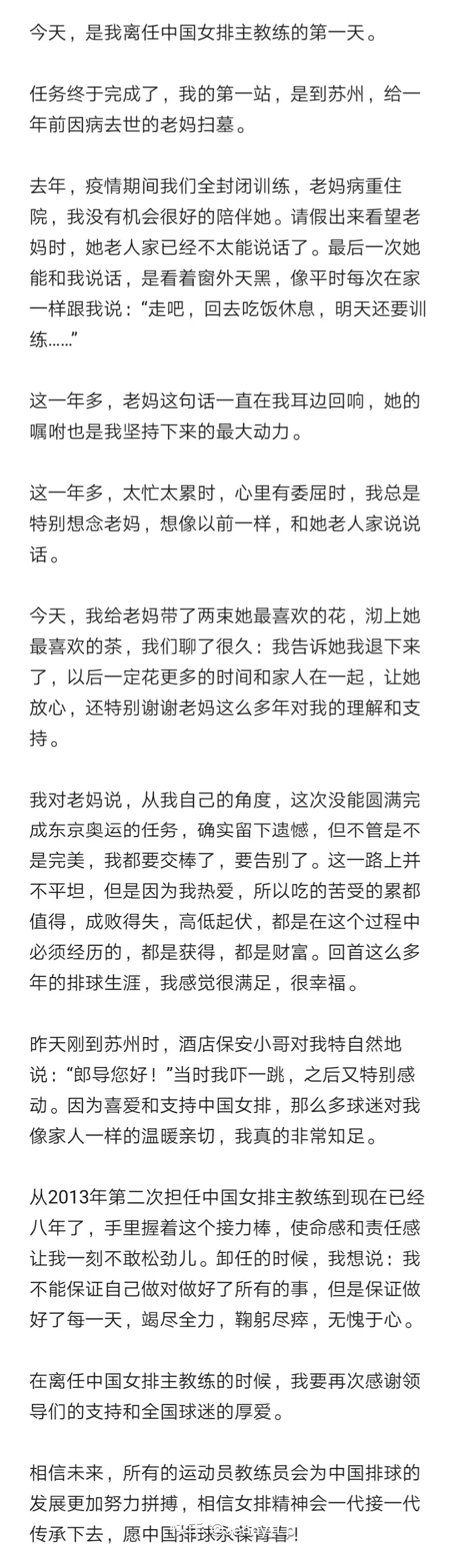 9月1日,中国女排主教练郎平在社交平台发文宣布自己已经离任。她说:“今天,是我离任中国女排主教练的第一天。”据了解,郎平1995年首次出任中国女排主教练,1996年获得国际排联颁发的世界最佳教练,2004年以全票入选世界排球名人堂,2013年再次出任中国女排主教练,2015年带领中国女排获得女排世界杯冠军,2016年里约奥运会带领中国女排夺得冠军。前不久的东京奥运会,中国女排小组未能出线。