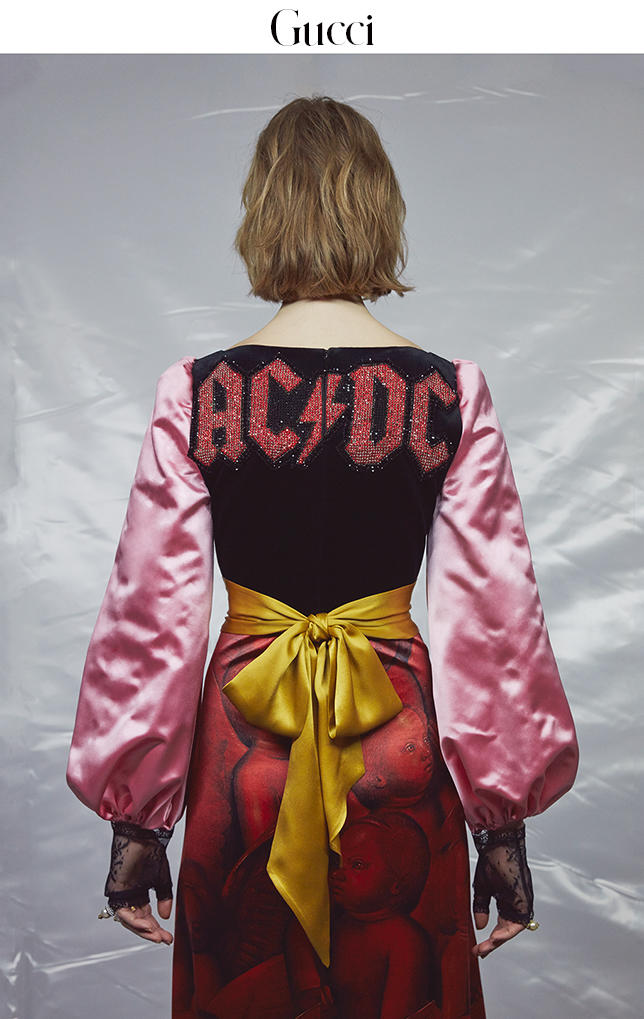 然而,尽管作品天差地别,Gvasalia 和 Michele 的时装理念却是相互交织的。这种联系在于当下,在于两人共有的文化意识。人们能够认可两位设计师提出的美学,以及他们的衣服所呈现的“宇宙”,他们能够把它们当做一种归属的标志。在 Vetements 的秋冬系列发布会上,一群高中生年纪的时装爱好者聚集在巴黎 8 区的一座教堂,穿着 Vetements 和古着的混搭,模仿那些跟他们年龄相仿、在街上找来的模特的造型。伸展台和现实之间的边界,一时间很难找到。在米兰,穿着 Michele 的皮草边拖鞋、中国风外套和点缀着花草配饰的观众,比 Gucci 的模特还多。Montenapoleone 街上新装修的 Gucci 店一个礼拜下来每天都人头攒动,而且不只是时尚人士。Michele 正在招揽那些曾经对 Gucci 的纨绔风格不屑一顾的消费者,他们现在对这些工艺精美的夹克、有繁重刺绣的裙装、带花朵图案或蜜蜂刺绣的手袋心仪不已。“拿去。”在最近的 Gucci 男装发布会后台,Michele 指着即将展出的一排排 Gucci 服饰对我说,“当它就是你的。”