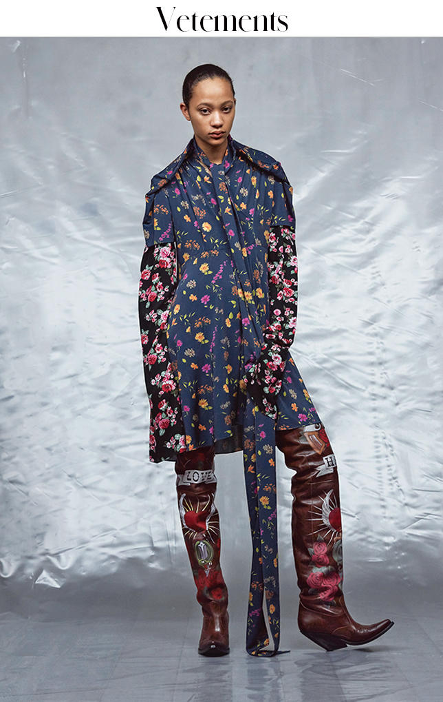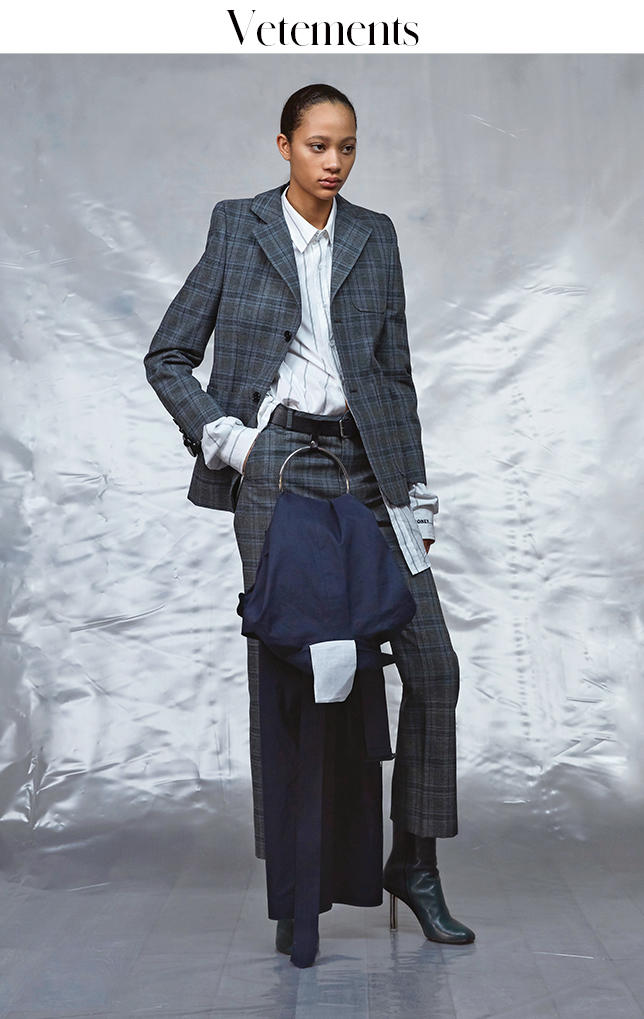 这正是这些衣服的诱人之处:Gvasalia 和 Michele 的设计并非是将某种轮廓强加在你身上,他们提出的是一些独立的、个人化的穿着选择。他们在给人穿衣服,而不是给他们“时尚”。这些系列本身包含了数不清的风格,可以用各种方式穿着。不存在潮流,没有既定的廓型,看不到鲜明的单一化主张。他们的作品推翻了此前占据主导地位的“total look”理念,也就是由设计师来提出一套从头到脚的完整装束(顺带一提,作为过去大约十年里的时装主流,这些“look”往往严格按照相应规范进行拍摄,放到杂志上,从而确保了一种单一的零售和营销形象)。Gvasalia 和 Michele 都把服装作为一种个体来考虑:一件出色的夹克,一条出色的裙子,一条漂亮的连衣裙,一双不错的鞋。他们在伸展台上把这些全都混到了一起,但其背后的设想是,它们可以拆分成独立的部分。Gvasalia 甚至就是因此而用了 Vetements 这个品牌名(它在法语里是“衣服”的意思)。“真的就是这样……就是关于服装。”他曾经这样告诉我。