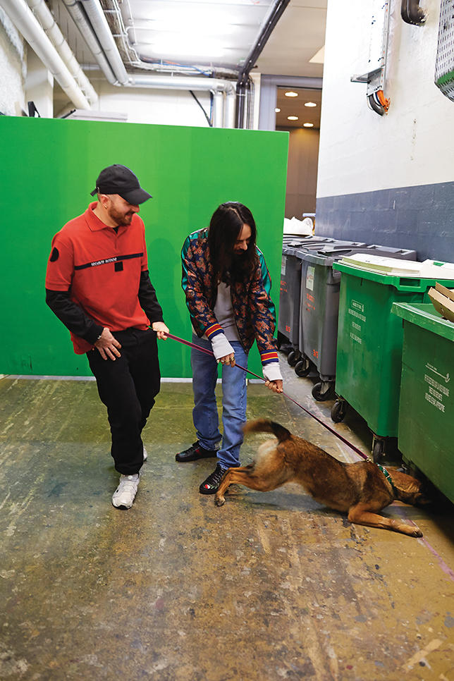 Michele:我认为这就是最佳的办法了:努力去找到一种事情正在发生的感觉。我只是说我,因为我在这一行是新人。我在自得其乐——我不会去想这些。但是,如果我在这一行待了足够久,我想我会觉得某种在改变的东西可以是表达你视角的一个好理由,而不是去抄袭。比如上一季我到处都能看到那种有点怪的装饰。但是时装的重点不是装饰(他摸了摸自己身上那件 Gucci 夹克的金属质感刺绣),时装的重点不是错误的尺码(指了指 Gvasalia 那件过大的外套,后者在一旁笑着)。你必须找到自己的语言,如果你去重复一些不是你的东西,不是你的语言,那就没有用。