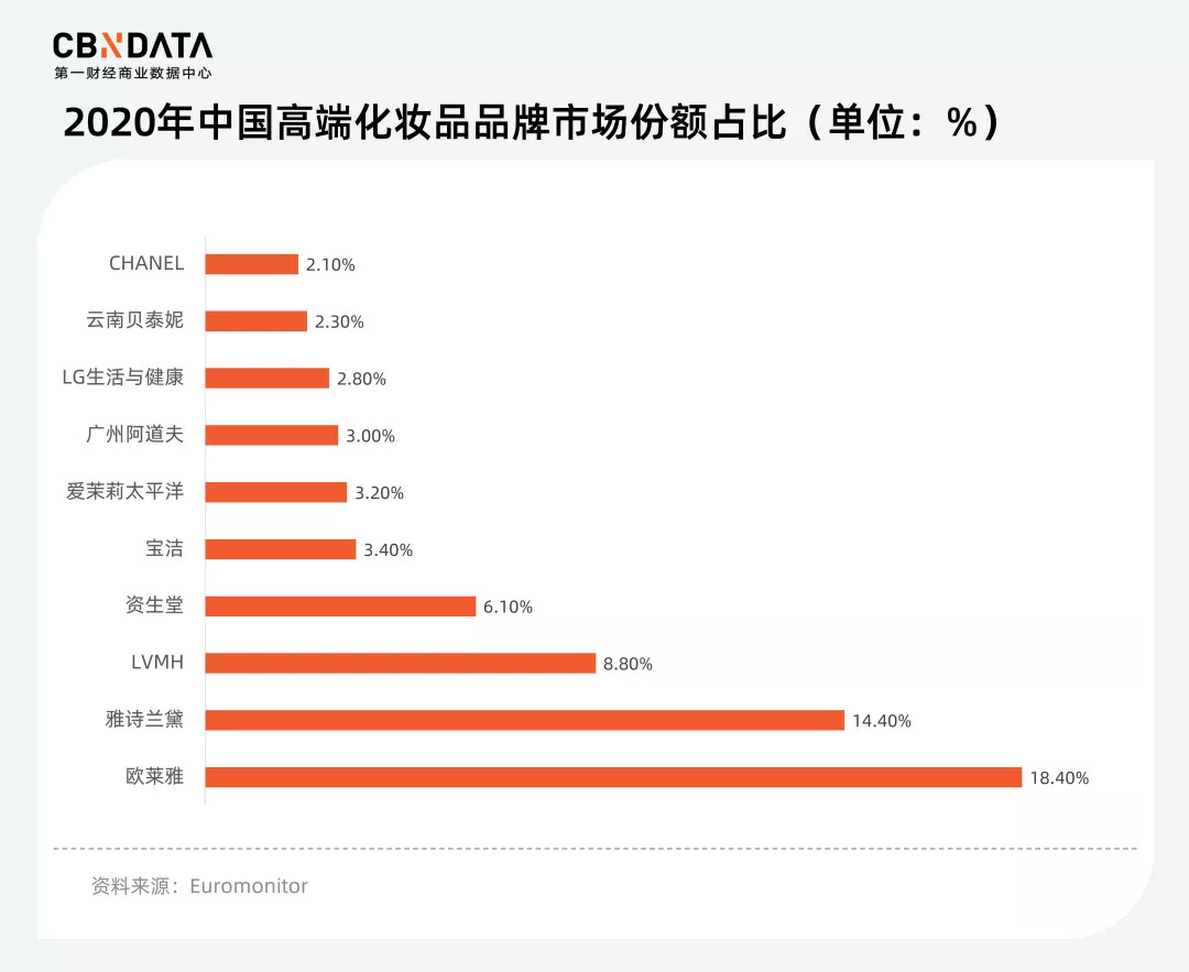 前瞻产业研究院数据显示,2019年高端化妆品销售规模达1518亿元,占化妆品零售额的51%,市场份额首次超越大众化妆品。2020年,欧莱雅、雅诗兰黛、LVMH四家巨头在高端美妆市场占有率为41.6%,竞争优势明显。十强中仅有贝泰妮一家为国内企业。