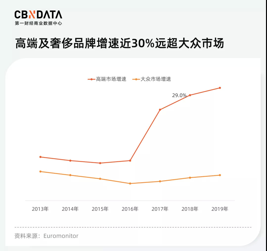 在海淘、代购和海外旅游等兴起下,高价美妆产品开始受消费者青睐,价差是主要原因。2015年,同样一瓶“雪肌精” 200ml化妆水在中国售价380元,而在日本药妆店基本3500日元(约合人民币200元)左右就能买得到。高端美妆市场在这一年开始崛起,大众市场则步入缩减期。