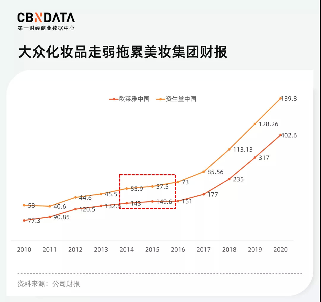 2015年,资生堂大众化妆品收入下降约25%;由于美即、NYX、美宝莲等大众品牌表现疲软,欧莱雅甚至在2016年首次取消了中国市场的业绩披露;高丝也逐渐剥离中低端产品在华的生产线,旗下本土化大众品牌美膳媛宣布天猫旗舰店于2016年4月1日停止营业。
