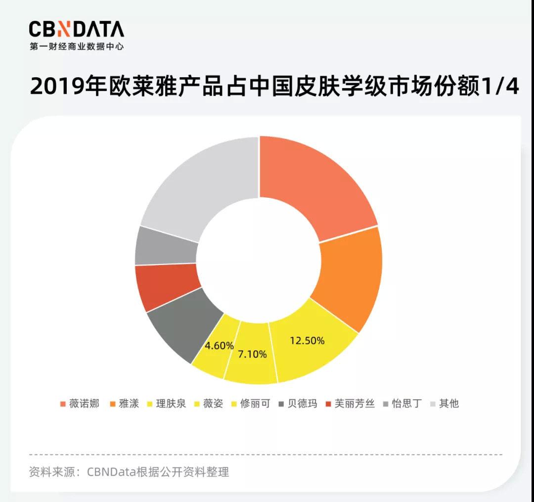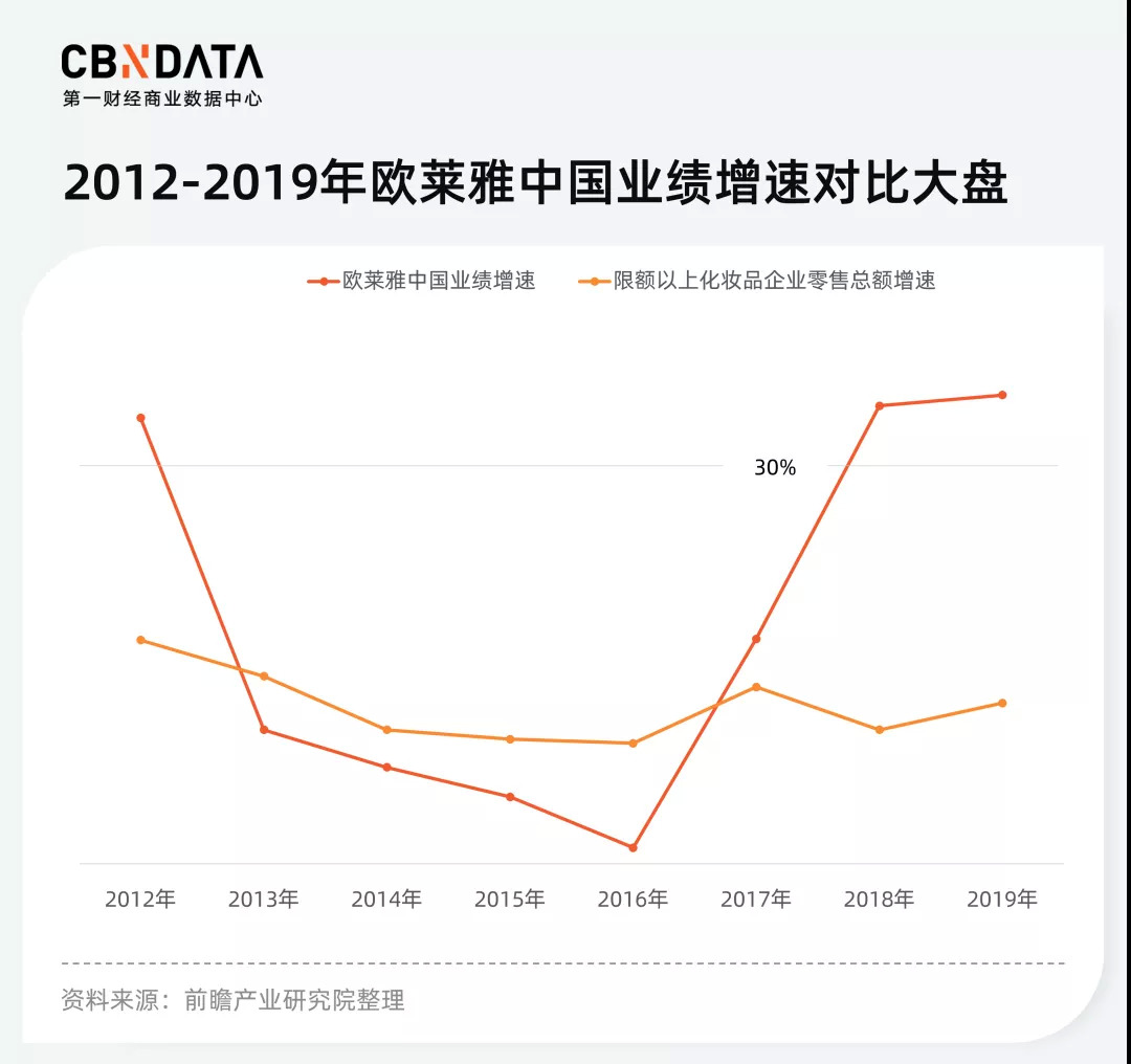 2)2013-2019年:欧莱雅在全球面临大众线品牌形象的老化,在中国则面临韩妆与国货品牌快速崛起的挑战。然而集团高端品牌线通过新营销模式与渠道,快速扩大影响力、市占率显著提升。2018、2019年连续两年业绩维持30%以上的增速。