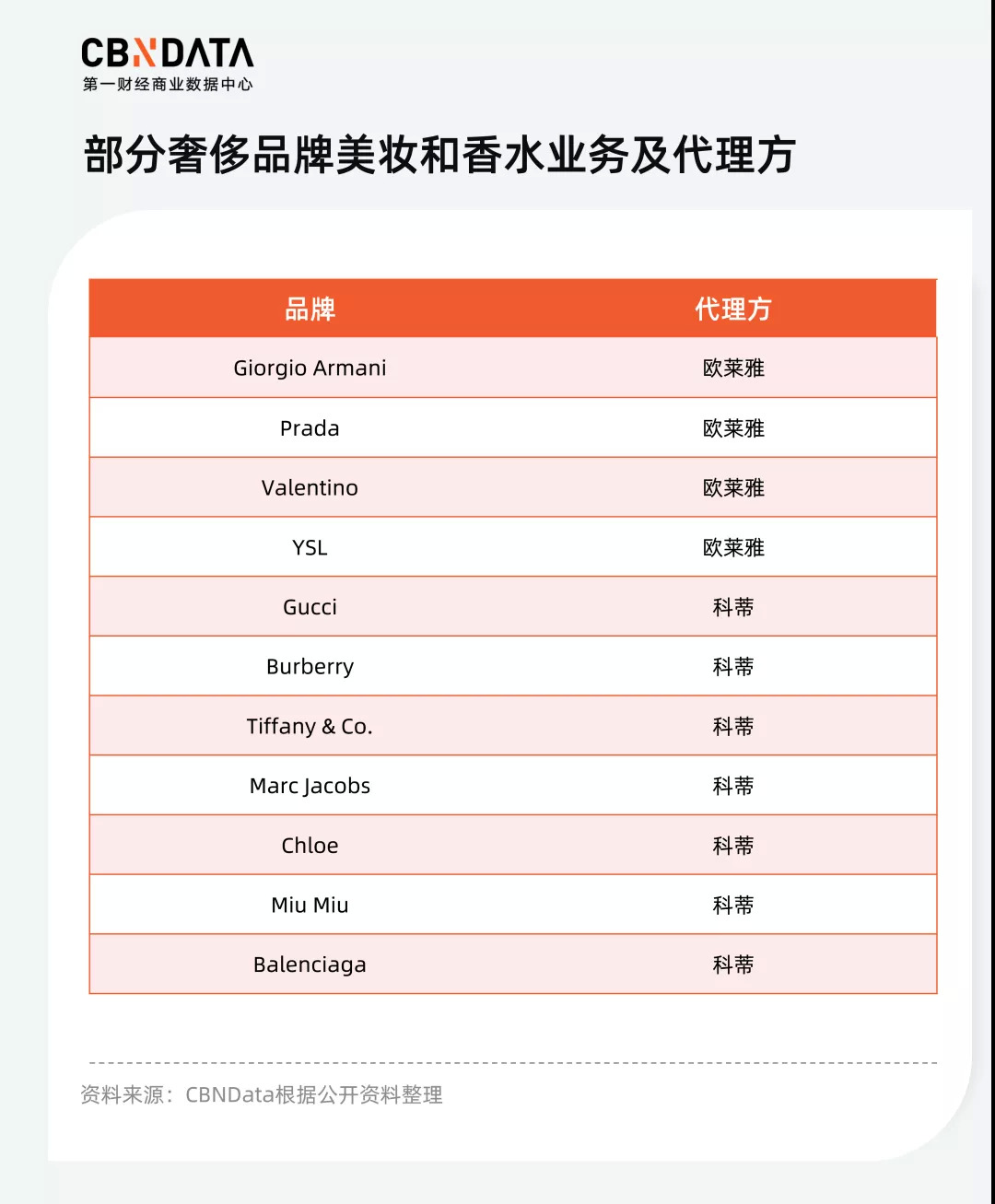雅诗兰黛代理的 10大品牌无一例外都是和轻奢或者奢侈品时装品牌合作发香水、化妆品产品线,这种方式也是其他化妆品集团(如欧莱雅)采用的常规方式之一。2016年,科蒂更是一口气从宝洁手里获得了41个香水、美妆品牌,其中包括Gucci美妆香水业务的代理权,2017年又获得了Burberry香水和美妆的授权许可。