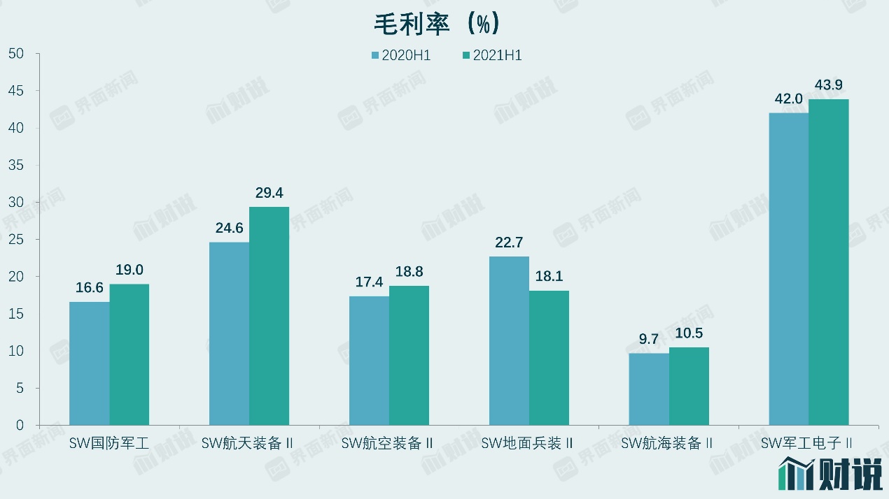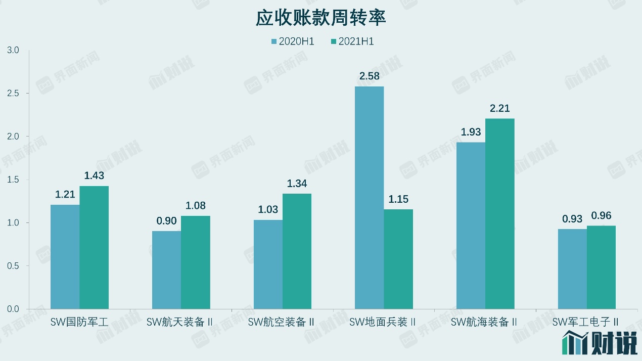 与此同时,军工公司应收账款情况有所改善,行业整体应收账款周转率从2020年上半年的1.21增加至2021年上半年的1.43,其中航空装备改善最为明显。