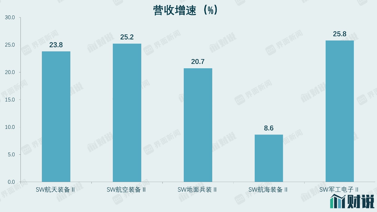 业绩方面,军工行业上市公司半年报营收增速平稳,这主要是由于军工订单一般于下半年结算,大订单带来的业绩尚未完全体现。除航海装备外,军工行业其他子板块都有20%以上增速,军工电子和航空装备营收增速相对较高,均在25%以上。