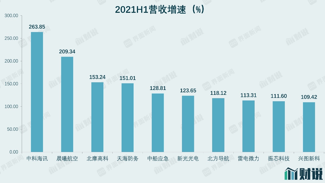 具体来看,上半年营收增速较快的军工公司以中小企业为主,如中科海讯(300810.SZ)上半年营收增幅达到264%。其中部分公司营收增速较快是由于2020年上半年疫情影响下低基数所导致的,中科海迅、晨曦航空(300581.SZ)等公司在2020年上半年营收均有较大幅度下滑。