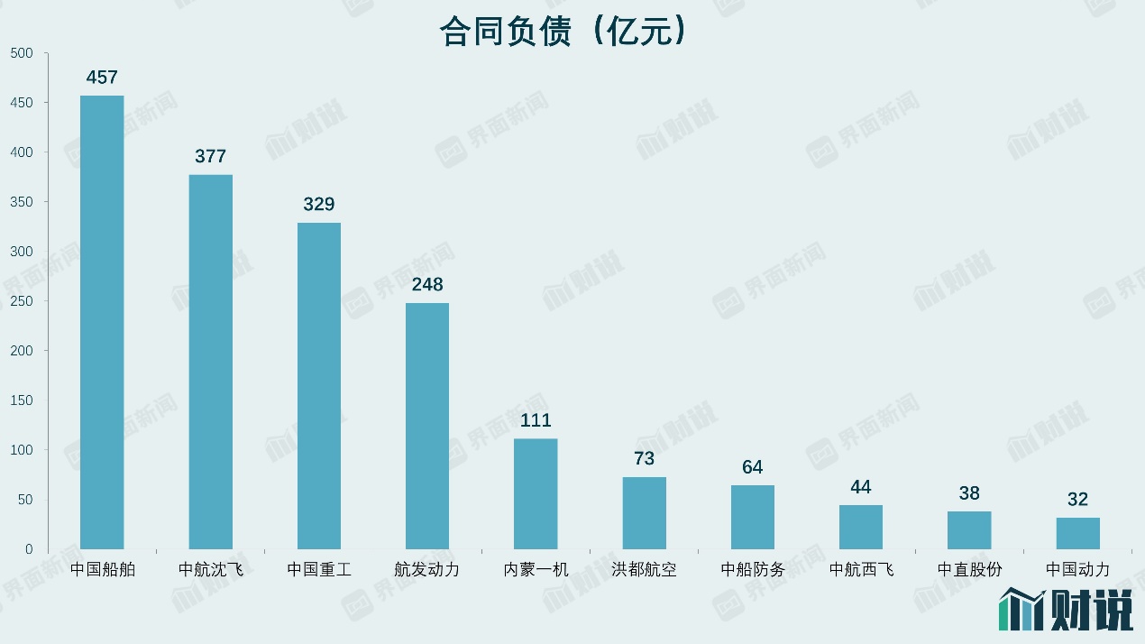 从合同负债绝对值看,中国船舶(600150.SH)最高达到457亿元,之后依次是中航沈飞(600760.SH)、中国重工(601989.SH)、航发动力(600893.SH)、内蒙一机(600967)等。