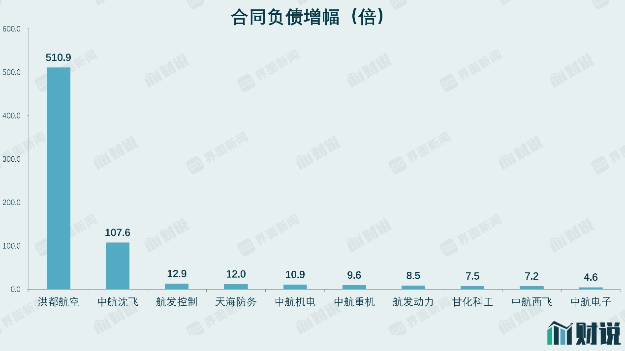 但从合同负债相比上年同期增长幅度看,却是另一个排名情况。洪都航空(600316.SH)增幅为511倍,中航沈飞(600760.SH)增幅为108倍。合同负债增幅前十的军工公司中,只有天海防务(300008.SZ)和甘化科工(000576.SZ)来自非航空行业。由此可见,此轮军工订单的下达并非“雨露均沾”,更多集中在航空装备领域。这也意味着,未来航空装备上市公司将有更大业绩弹性。