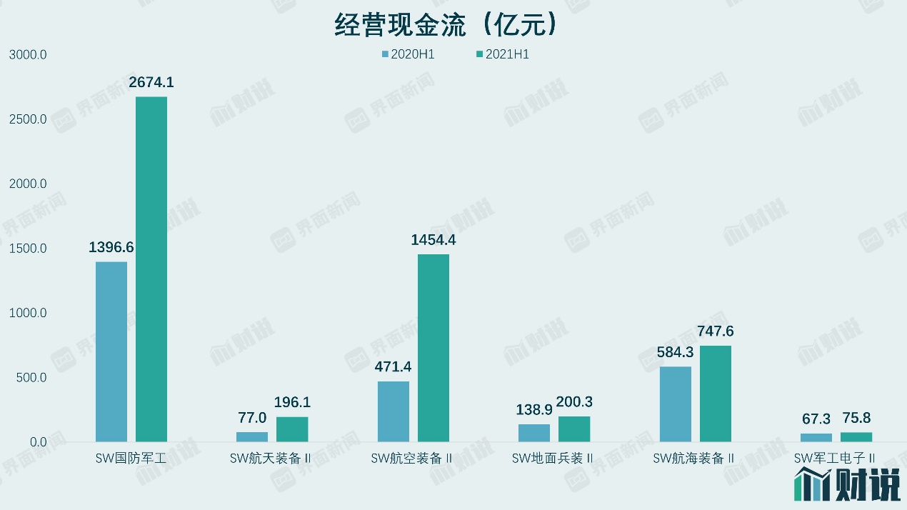 通过预收和预付的不断传导以及应收账款好转,军工行业特别是航空装备行业整体现金流情况出现大幅好转。航空装备行业2021上半年经营现金流合计流入为1454亿元,同比增长超过2倍。