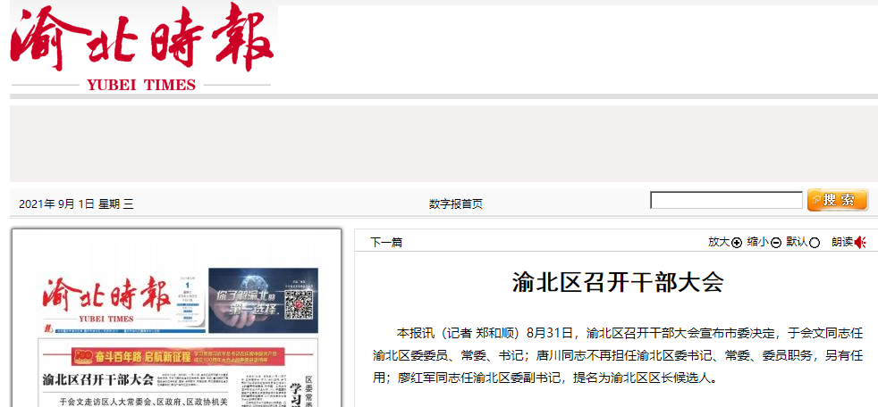 据重庆《渝北时报》消息,8月31日,渝北区召开干部大会宣布市委决定,于会文同志任渝北区委委员、常委、书记;唐川同志不再担任渝北区委书记、常委、委员职务,另有任用;廖红军同志任渝北区委副书记,提名为渝北区区长候选人。