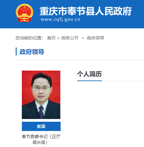 重庆市奉节县政府网站“政务公开”栏目近日进行更新,据最新名单显示,张果已任奉节县委书记,杨树海不再担任。