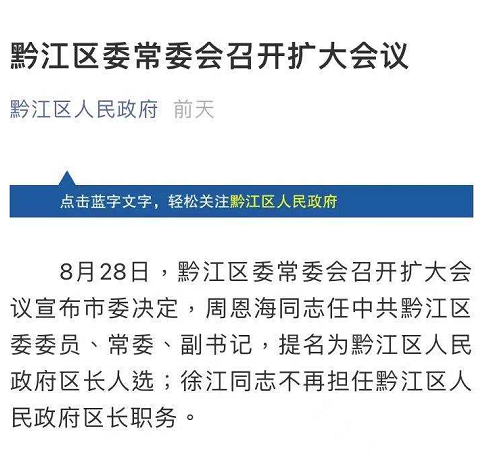 8月28日,黔江区委常委会召开扩大会议宣布市委决定,周恩海同志任中共黔江区委委员、常委、副书记,提名为黔江区人民政府区长人选;徐江同志不再担任黔江区人民政府区长职务。