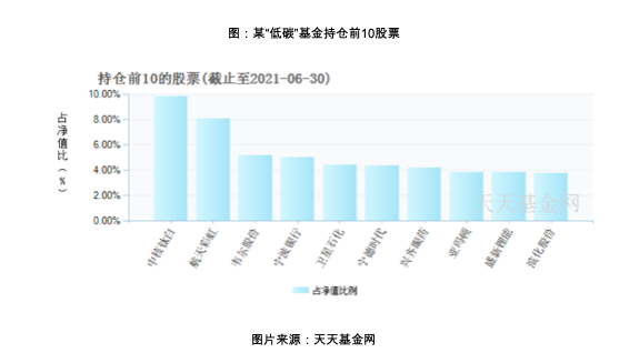 A股公募基金也存在类似的问题。笔者打开某基金网站,输入“环保”、“低碳”、“ESG”等关键词筛选基金,并观察其2021年上半年披露的前十大重仓股票,大量ESG相关基金持有石化、化工、铝业、房地产、白酒等与低碳环保理念相悖的行业。