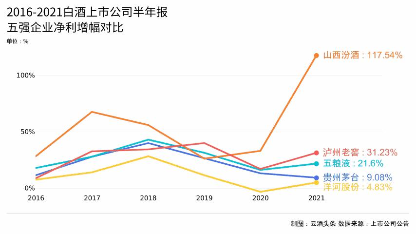 再看这一周期内“争三”的洋河、汾酒与泸州老窖。汾酒在五强企业中增速最快,营收增幅平均值达到38.83%,利润增幅平均值达到60.05%,其中2021年上半年实现爆发式增长,营收增幅为75.51%,利润增幅高达117.54%;泸州老窖增速适中,营收增幅平均值为17.40%,利润增幅平均值为31%;洋河营收增幅平均值为9.79%,利润增幅平均值为11.06%。