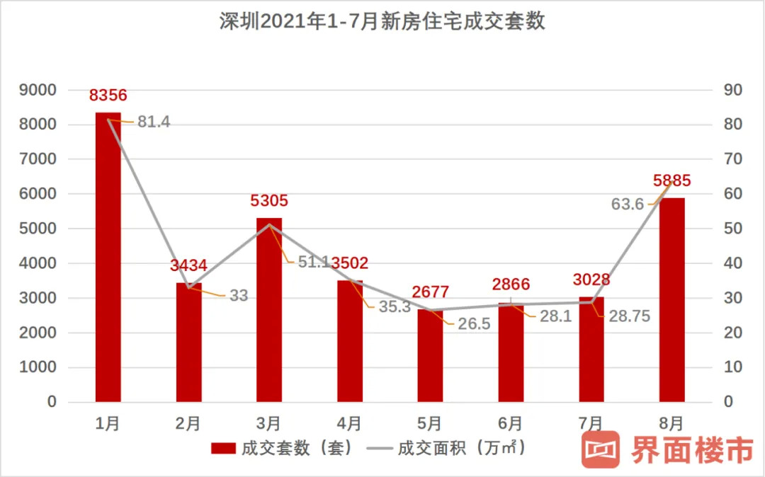 而在刚刚过去的8月,据第一数据统计,深圳成交5885套新房住宅,环比大增94.4%,成交面积达63.6万平方米。